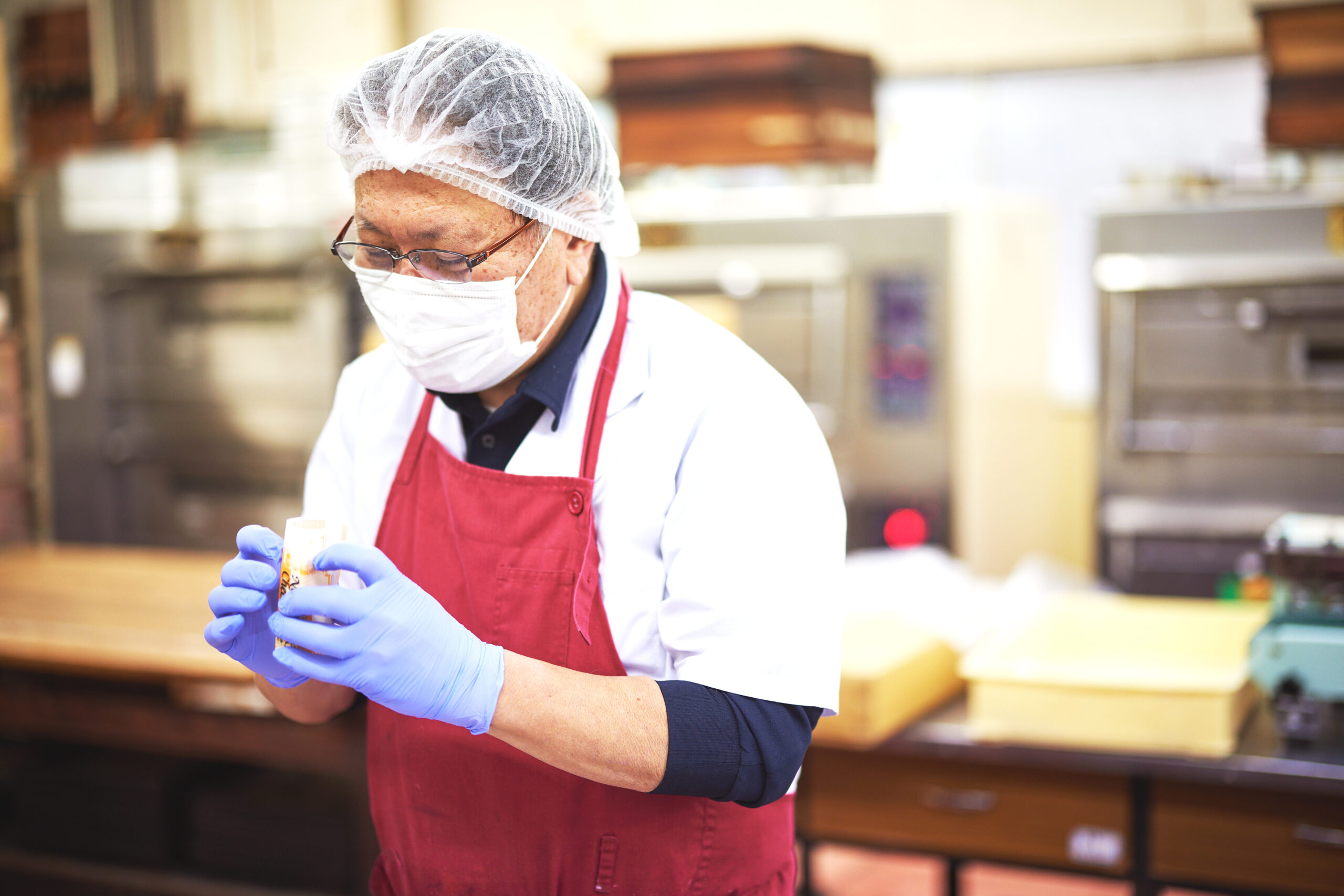 パッケージも手で1個1個包んでいくのでかなりの労力。キャンディのように両端をくるっと巻いて包んでいた時期もあったが、一目で形状がわかる現在のスタイルに落ち着いた。