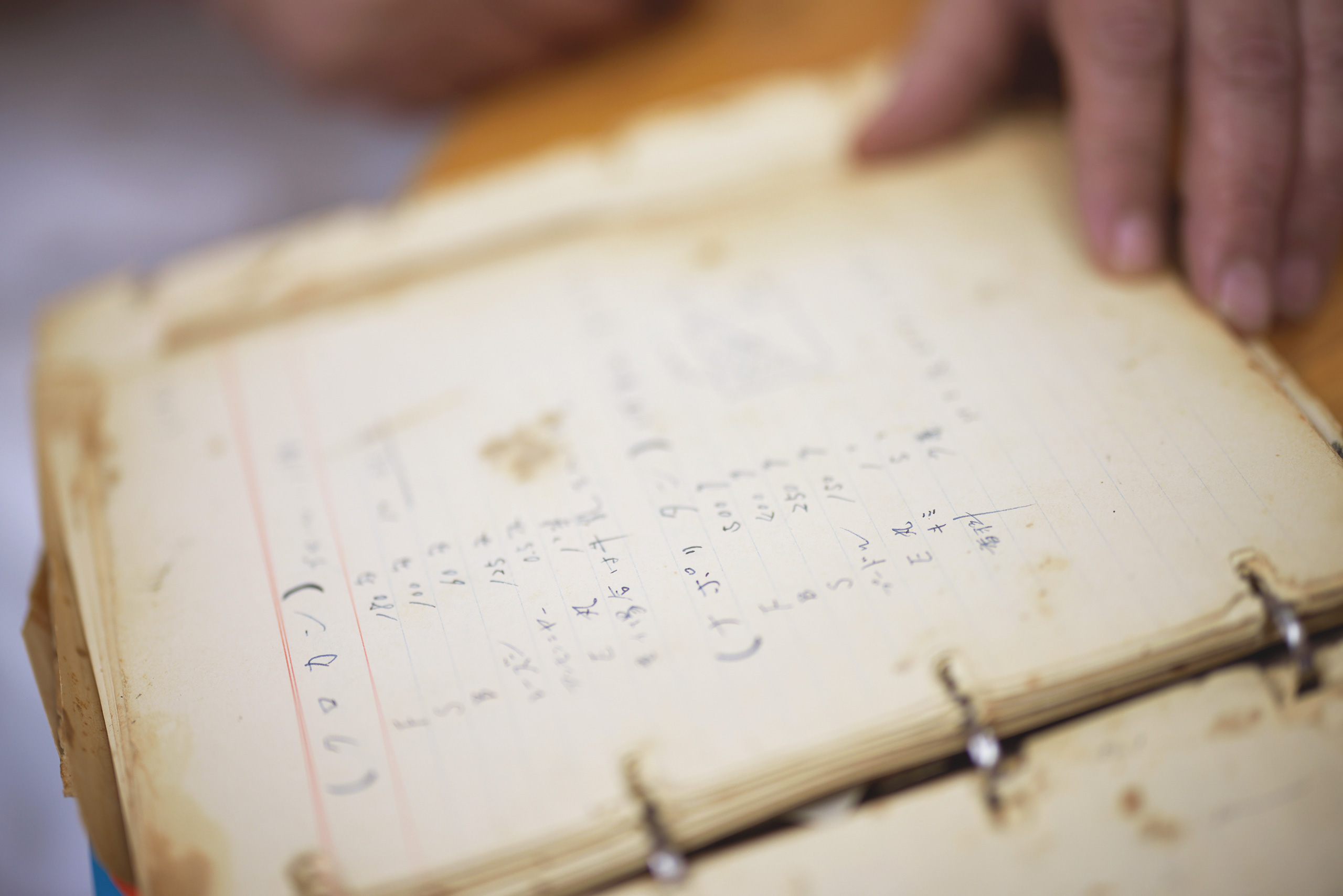 父が残したレシピノート。商品ごとに読みやすい字できっちりと整理されている。創業者はさぞ几帳面な方だったのだろう。ちなみに使われている「匁(もんめ)」は、昔の重さの単位。1匁=3.75gで、5円玉の重さ。