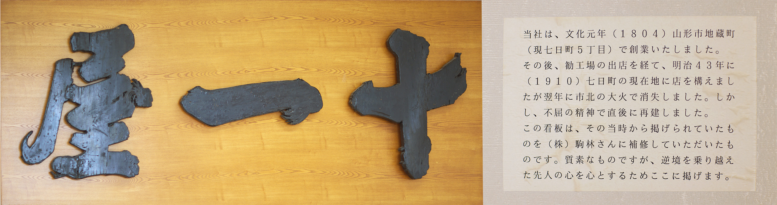 明治43年(1910年)に七日町の現在の地に構えたお店。翌年の大火でお店は焼失した。現在、山形市内の工場に掲げられているのは、この時の看板だ。