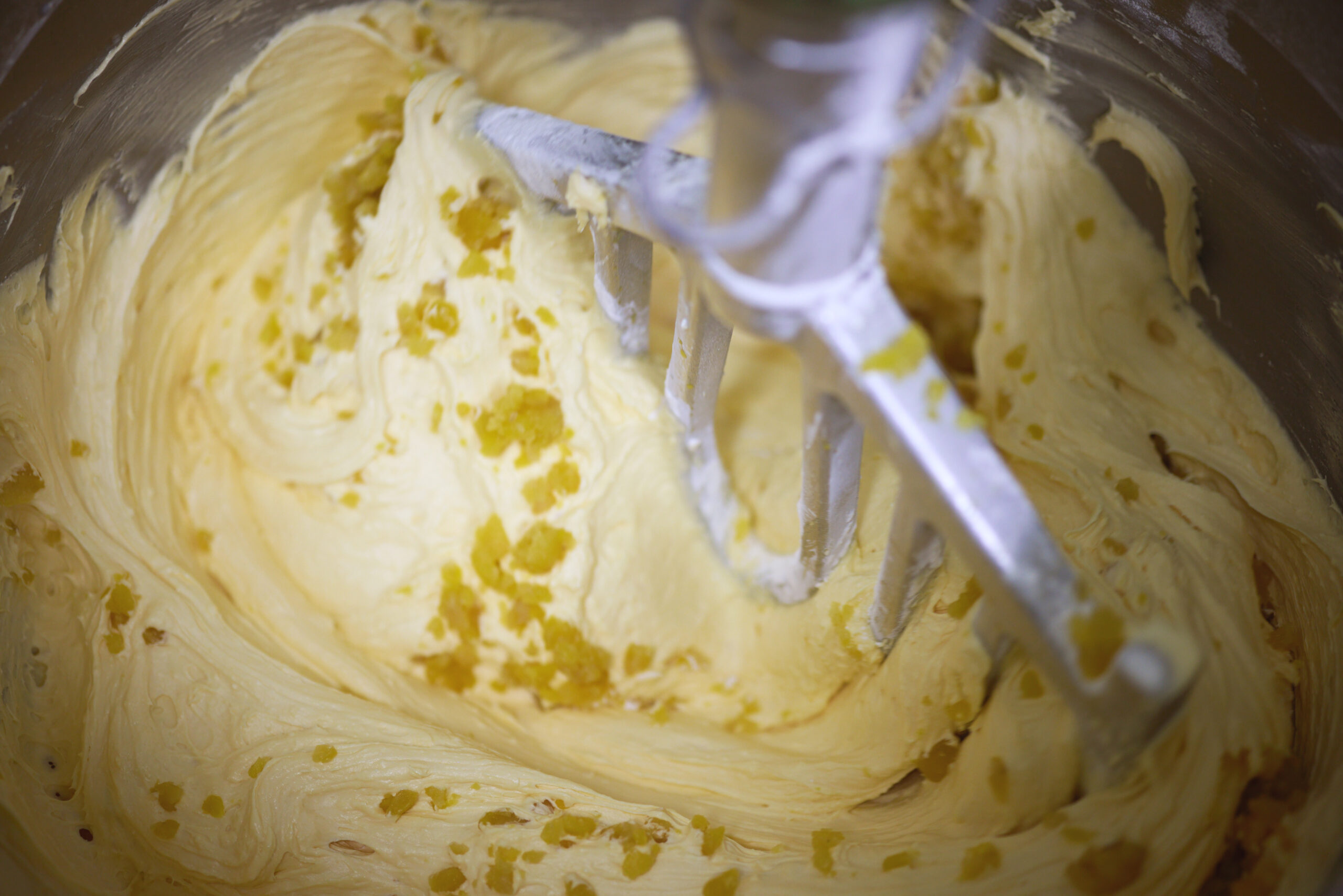 バターにチーズを入れて、なめらかになるまでよく混ぜる。その後は、砂糖を入れ、ハチミツでしっとりさせる。白っぽくなってきたら、卵を少しずつ混ぜながら入れていく。混ぜるのは機械とはいえ、片時も目は離せない。