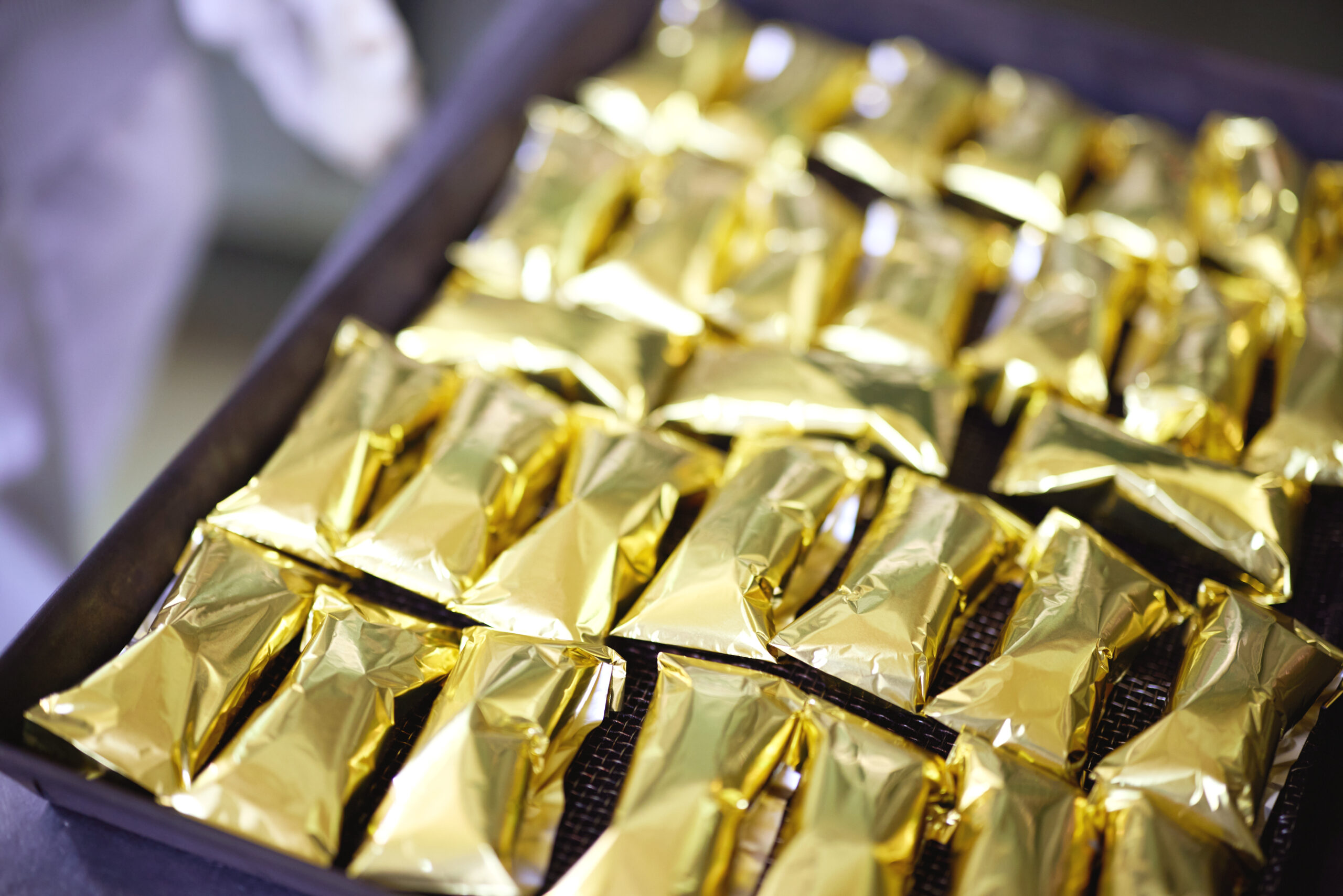 その風味を金色のホイルで包むことで、開けた瞬間、一気に甘い香りがふわっと広がり、食欲をそそる。