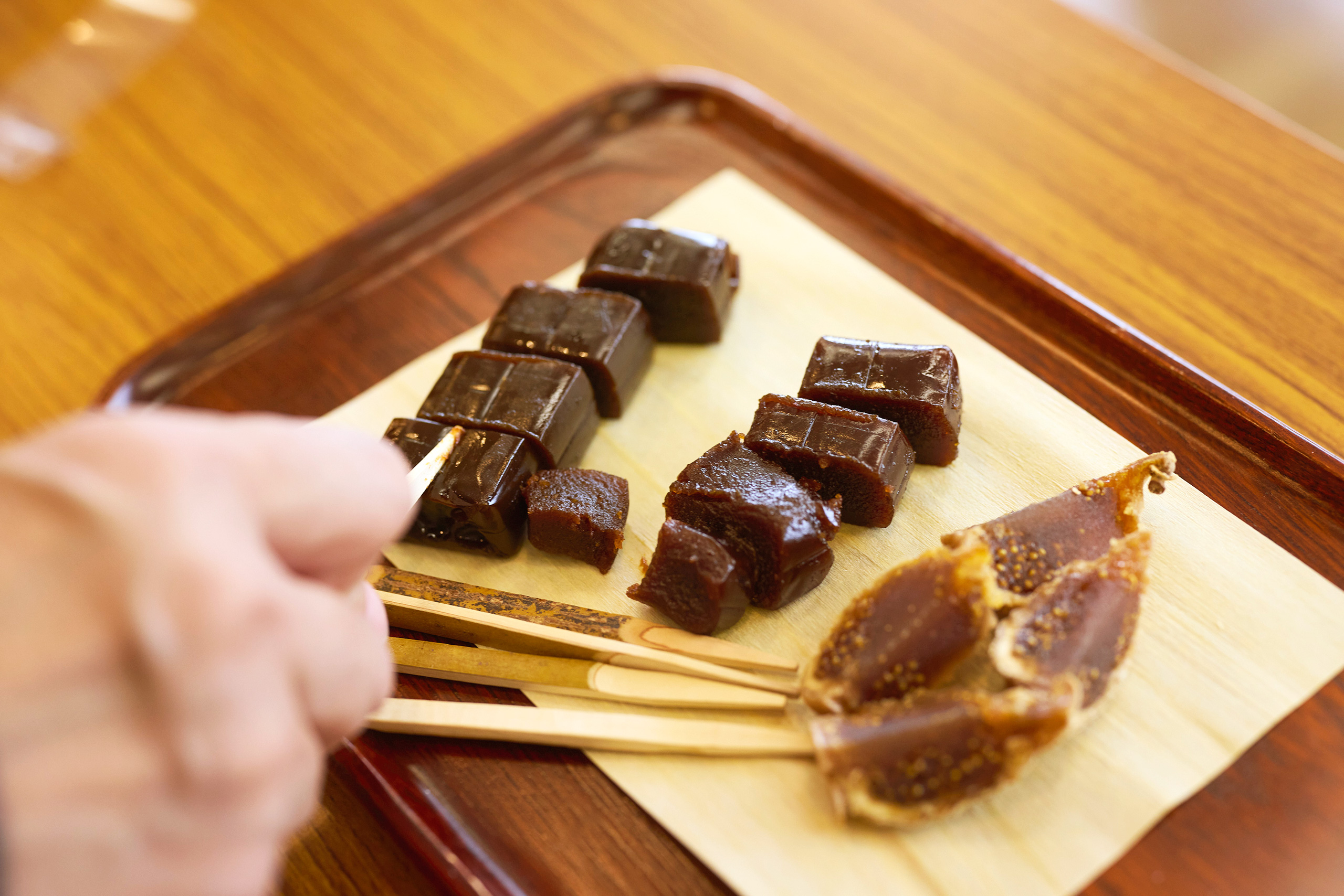 右にあるのが、ドライいちじくの中に五勝手屋羊羹を詰めた「回/Re-Fruit」。甘みとねばり、瑞々しさが溶け合う芳醇な組み合わせで、プチプチとはねる種の食感も楽しめる。