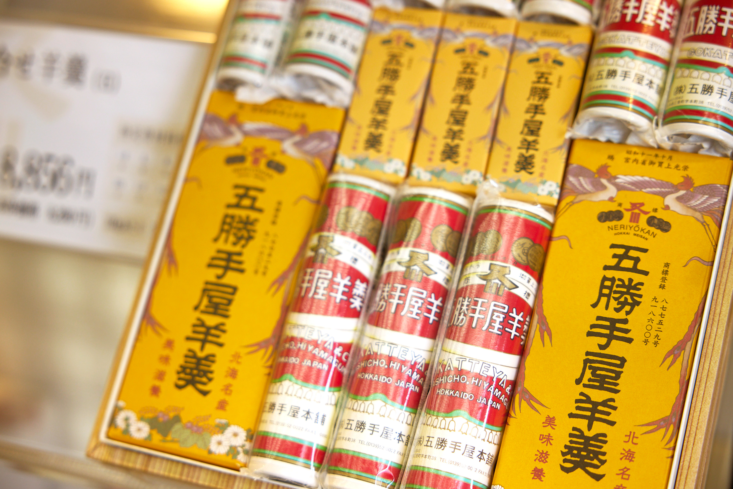 十勝産金時豆をつかった「流し羊羹」と「丸缶羊羹」の詰め合わせ。「流し羊羹」に使われているパッケージデザインは、創業当時と同じという。