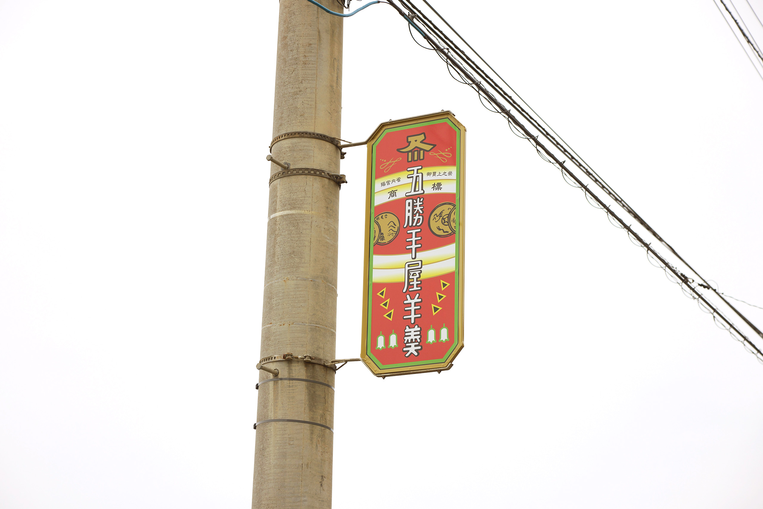 江差の町を歩いていると、電柱に掛かった『五勝手屋』の袖看板が目に留まる。細長いその形は、まるで看板そのものが「丸缶羊羹」になったようだ。