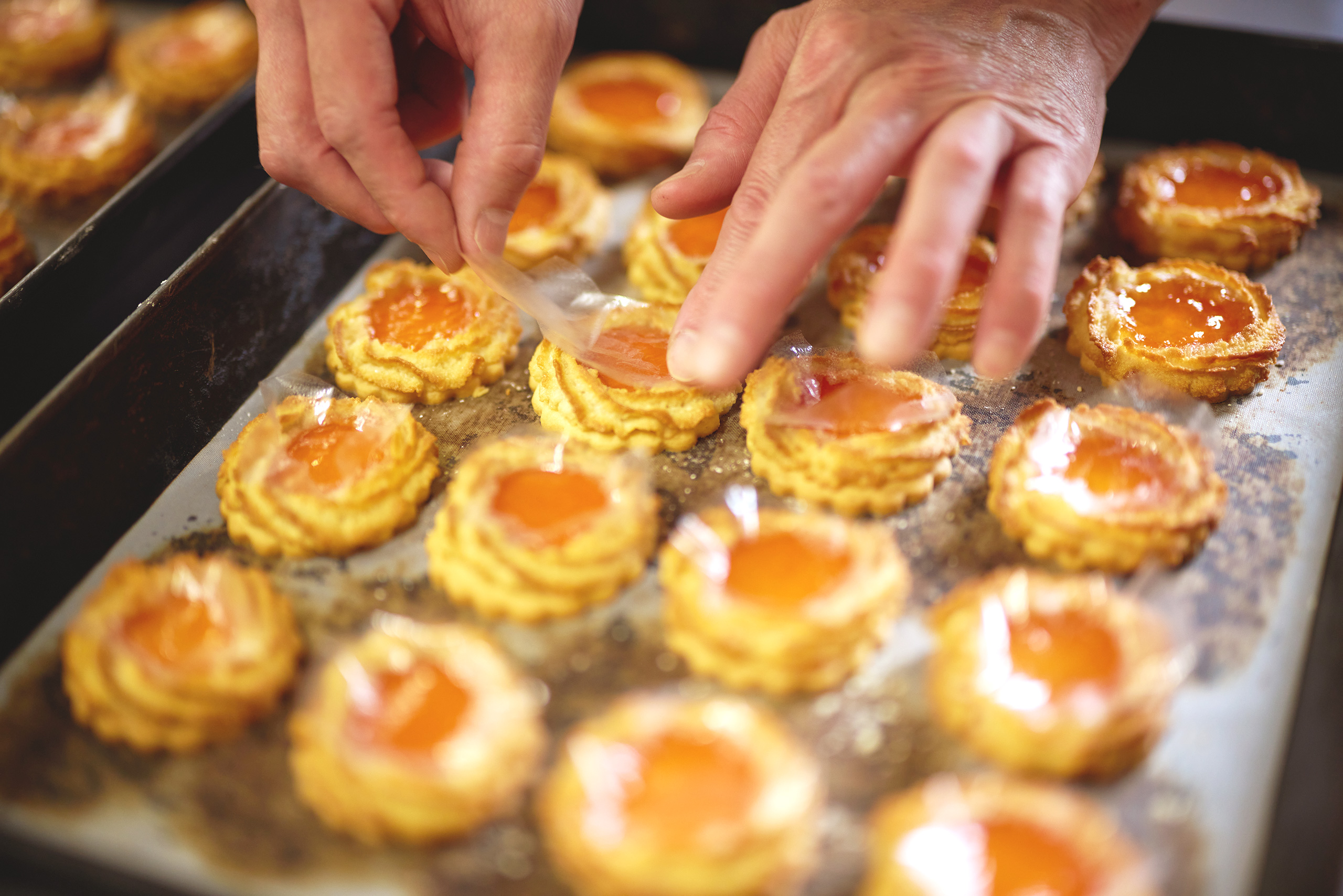鮮やかな杏ジャムのトッピングはお花のように可愛らしいが、元々の「ロシアケーキ」は軍人さんの勲章をイメージしていたという説もあるとか。
