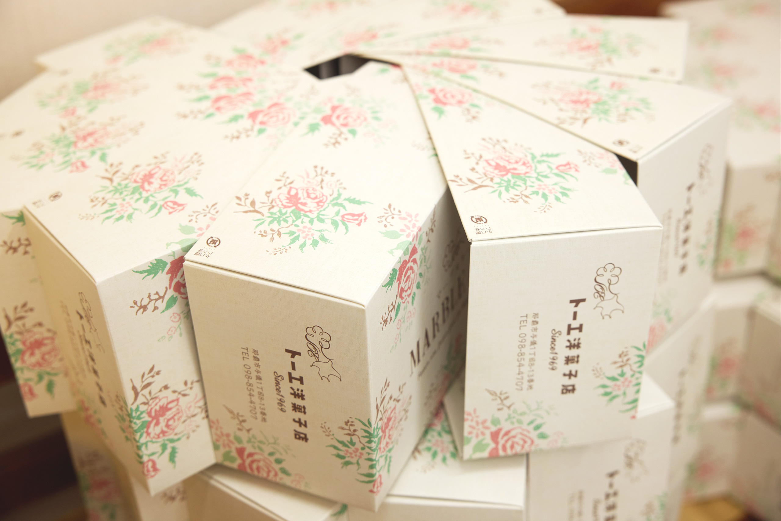 お店に入ると、可愛いバラの花柄の箱がうずたかく積み上げられている。