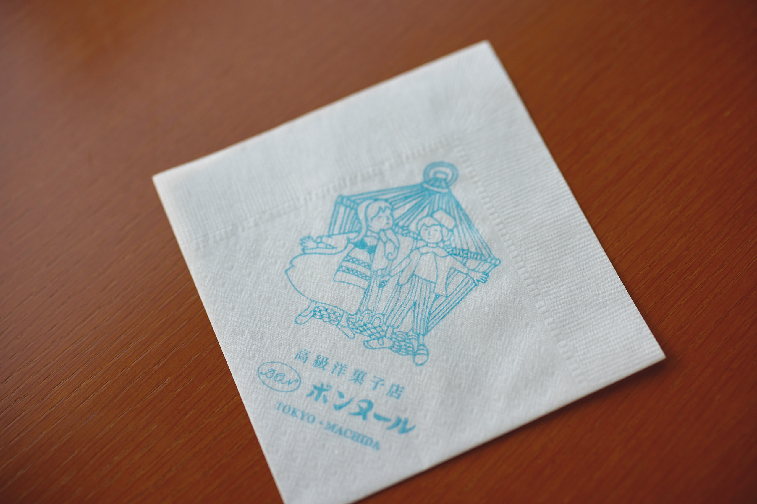 店名の『ボンヌール』が幸せという意味から、包装紙やナプキンには、幸せを運ぶ青い鳥のチルチルミチルのイラストが使われている。