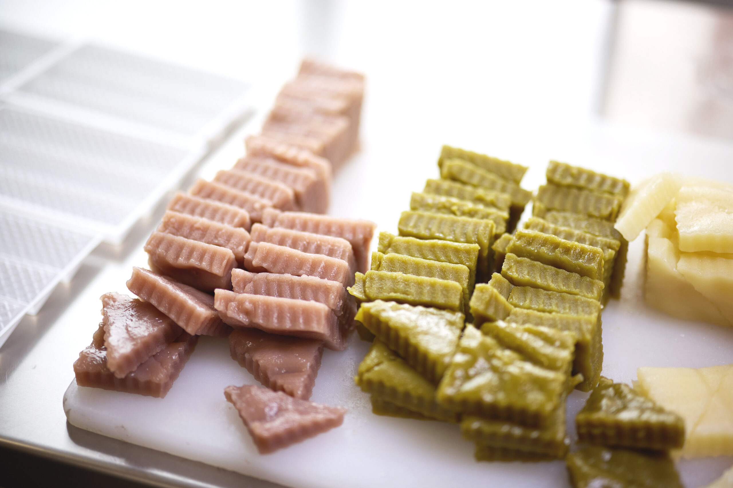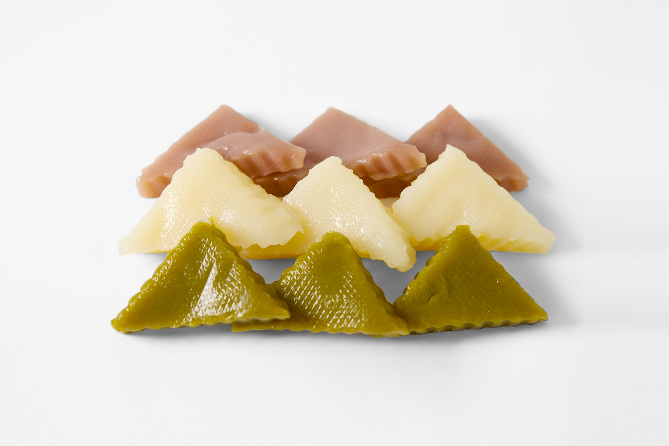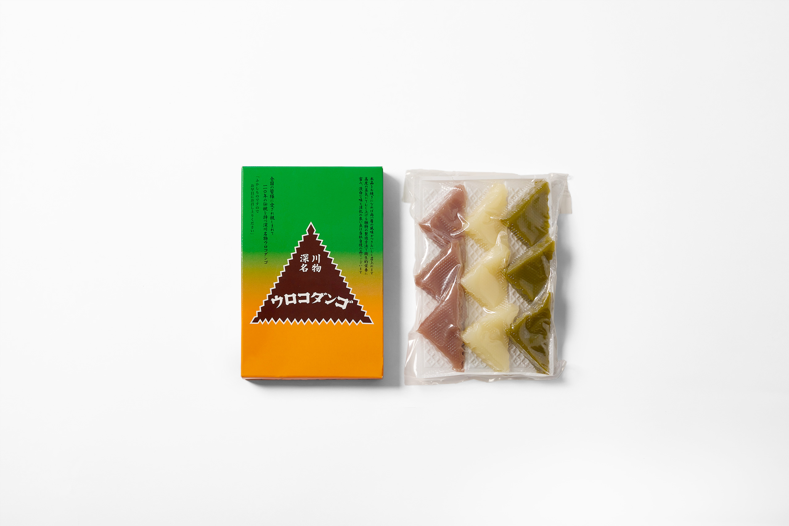 波のようにギザギザした三角形の小さなお団子はプレーン・小豆・抹茶の三つの味が楽しめる。インパクトのある「ウロコダンゴ」の名前と、緑とオレンジの鮮やかなグラデーションのパッケージ、そしてユニークな三角形の形状は、100年以上前の誕生時から変わらない深川の名物。